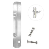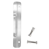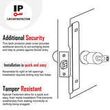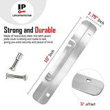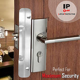 Details: The LP 230 latch protector is manufactured using heavy 12 gauge plate steel for maximum security. Zinc plated with brushed finish. 1-3/4" Wide x 10" High Tamper Resistant, Special Fasteners which allow for a quick and easy, flush inside Installation. This prevents weatherstrip from sealing incorrectly or clothing being snagged Latch Protector steel plates completely covers latch area so latch bolt can't be retracted Reversible for right or left openings. Installation requires drilling only two holes Intended for 1-3/4" thick doors, Outward Swinging Doors with any Lock up to 3-1/2" diameter Rose or Escutcheon with 2-3/4" backset This model Installs on rose or escutcheon 3-1/2" or less. Also Type 86 mortise or Type 161 cylindrical locks. SPECIFICATIONS: Plate: 12 gauge steel, .105" thick. Two square holes in plate. Bolts: Two carriage bolts 5/16-18 x 1-1/2" long with special fasteners. Finish: Zinc plated with brushed finish. Latch Protector products are made using high quality materials. Item is packaged in a clear poly bag.